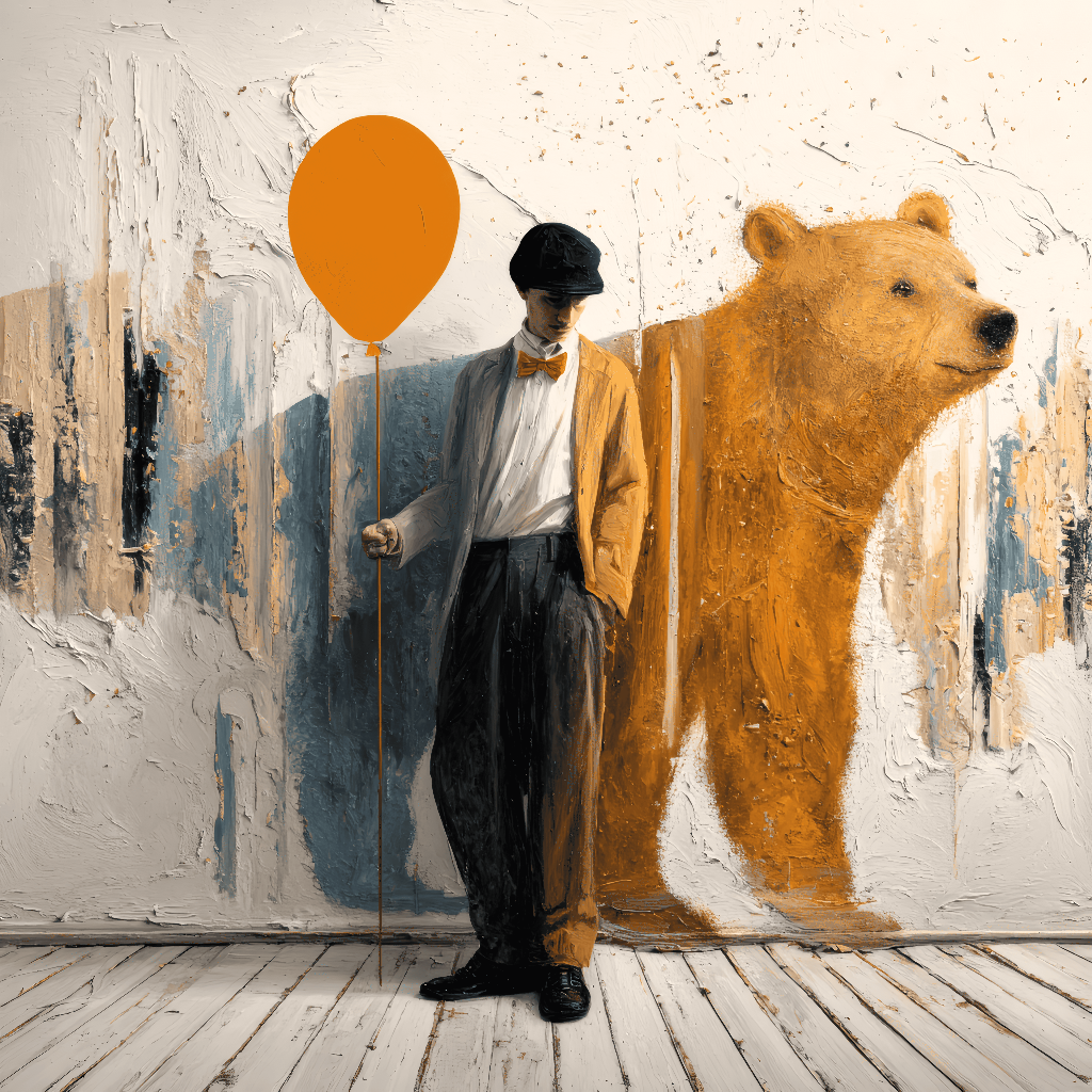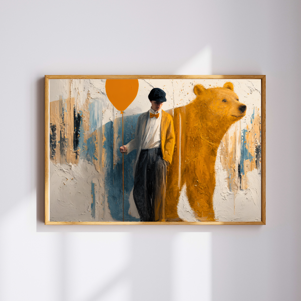 Playful and thought-provoking surreal artwork featuring a faceless figure in retro attire holding an orange balloon, accompanied by a textured bear against an abstract painted background. The piece celebrates whimsy and innocence, with bold color splashes and a modern art aesthetic suited to galleries and unique interiors.​