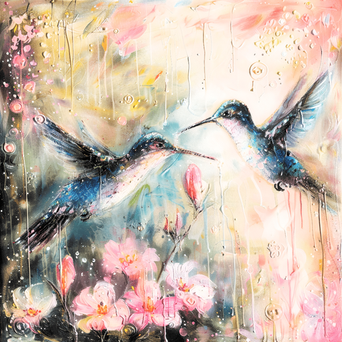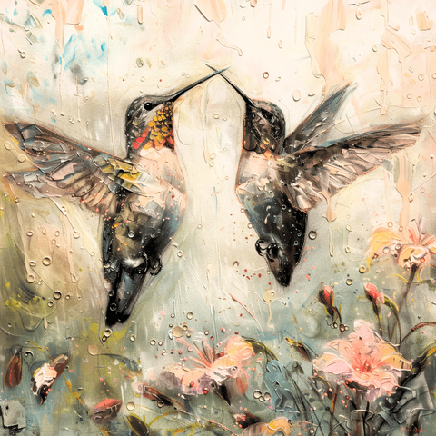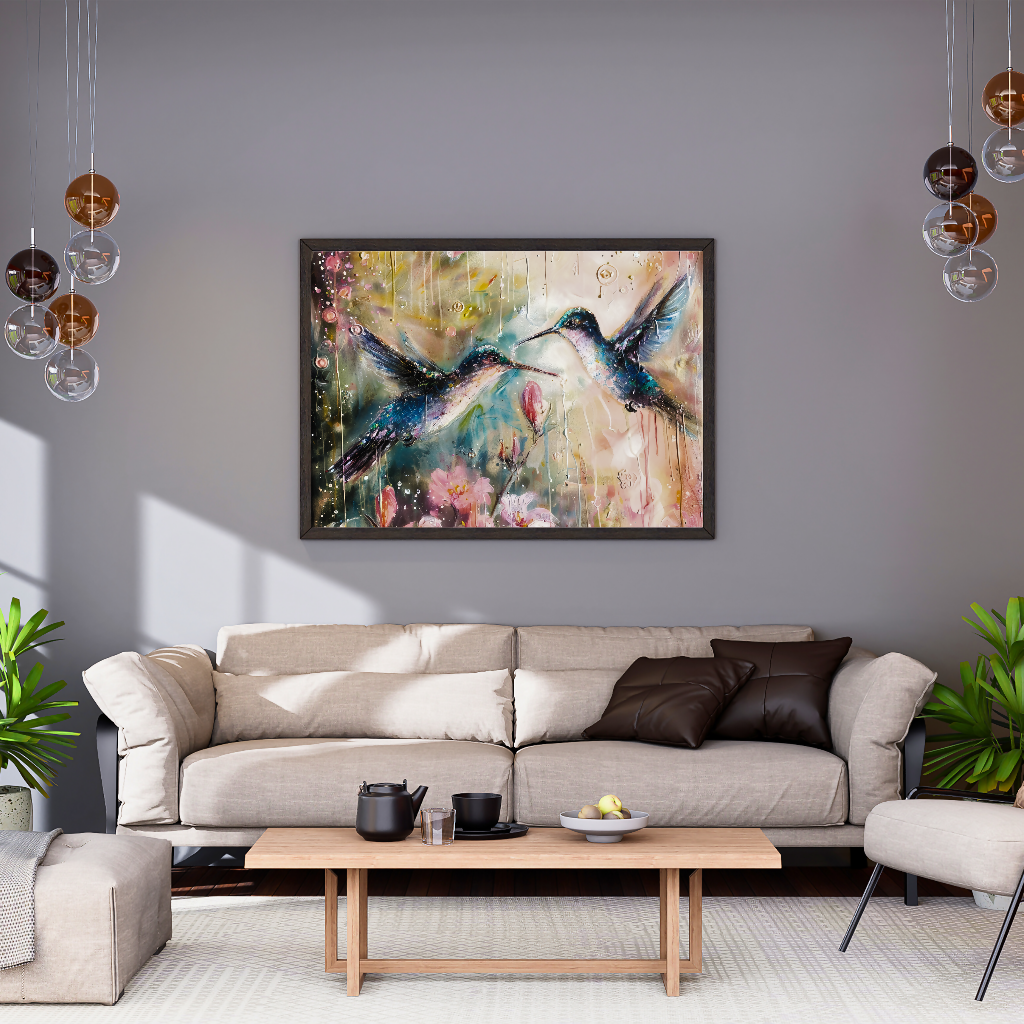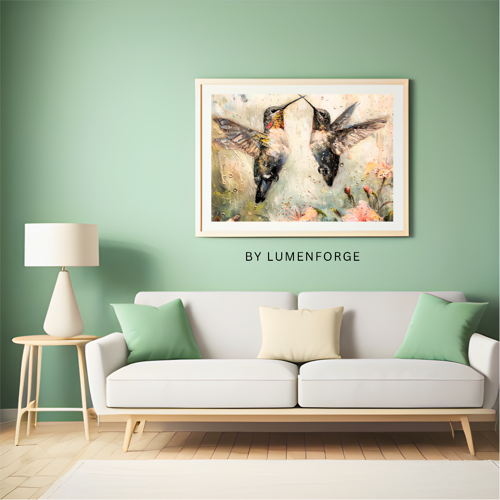 Uplifting nature painting rendered with impressionist strokes, featuring two lively emerald hummingbirds in motion among blooming flowers and lush green brushwork. The artwork celebrates vitality, harmony, and the beauty of the natural world for elegant, modern displays.​