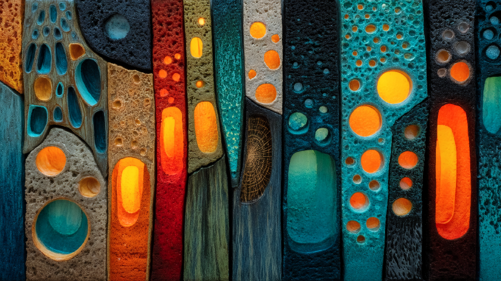 A vivid abstract artwork showcasing organic, textured forms with vibrant colors and illuminated details. The interplay of sculpted holes and glowing blue, orange, and red tones creates a dynamic, tactile visual effect that evokes warmth and motion. Perfect for modern interiors and collectors seeking energy and originality.​