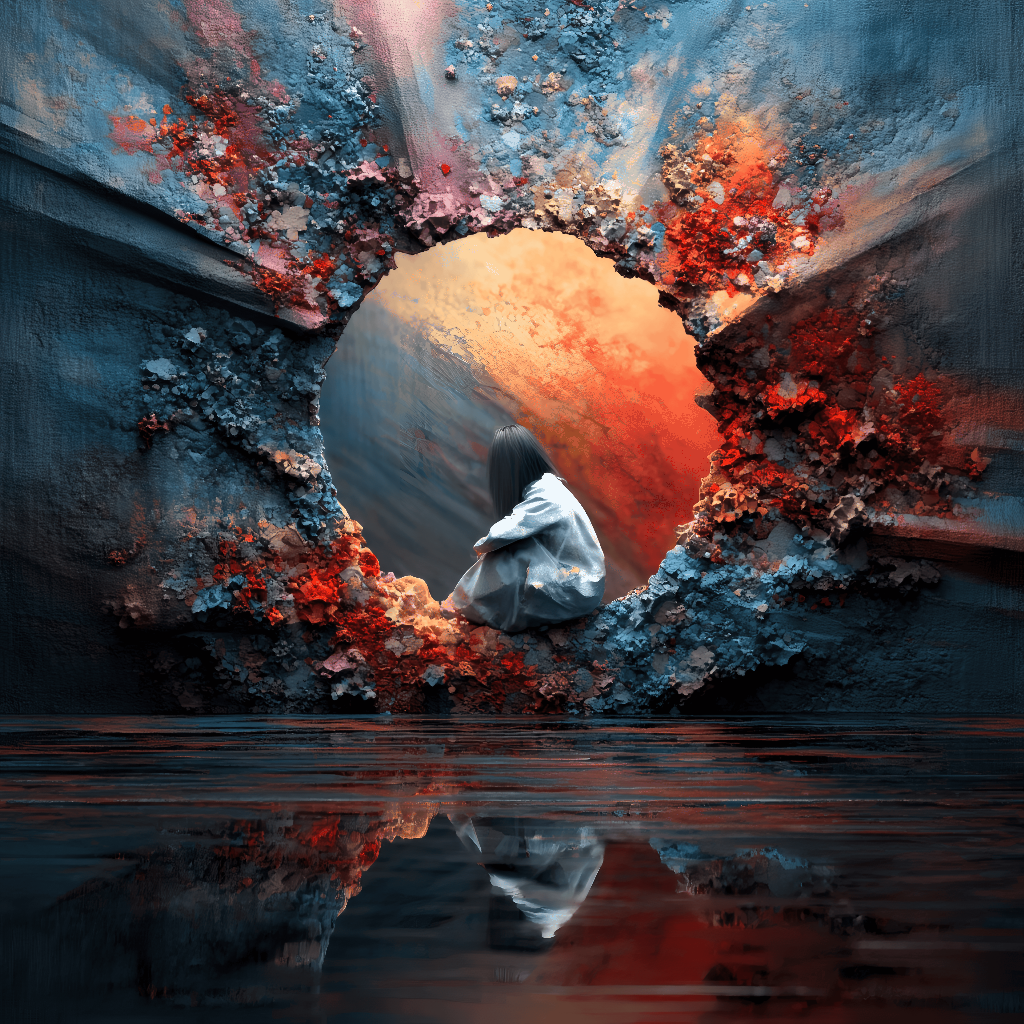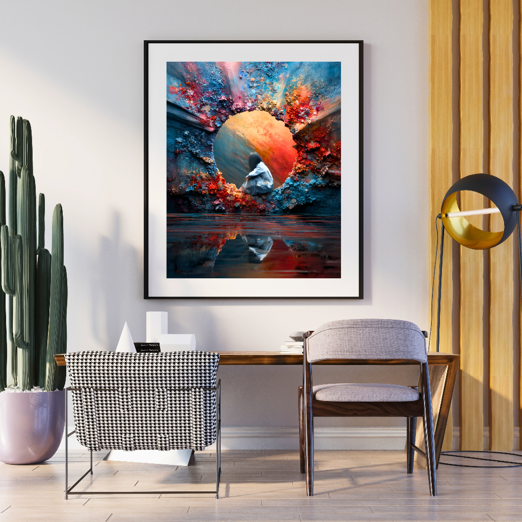 Immersive contemporary art depicting a solitary figure gazing through a circular portal framed by expressive, textured pigments in blue and orange. The reflective water beneath amplifies the evocative atmosphere, suggesting introspection and personal journeys—an ideal piece for modern spaces and collectors of emotional art.