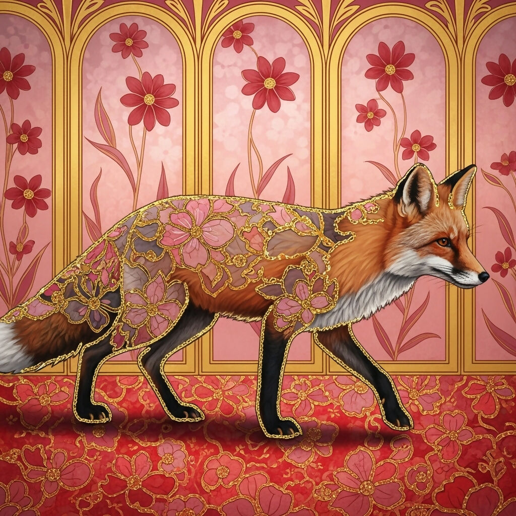 A graceful red fox strides across an ornate, floral carpet, its fur seamlessly overlaid with pink blossoms and gold filigree. The background features arched Art Nouveau panels in warm shades of rose and gold, echoing the floral lace that traces the fox’s body. Rich details, elegant linework, and a romantic pink-and-red palette give this piece a luxurious, storybook feel.