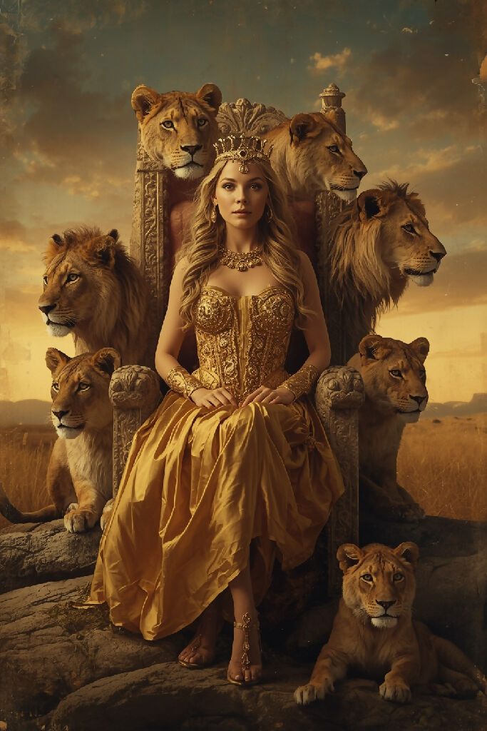 Artemisia and her pride, ready for departure to hunt, set against a warm savanna backdrop at dawn, in a 70s-style film poster, quoting the dramatic composition of The Conspiracy of Claudius Civilis by Rembrandt, with Artemisia as the central humanized striking anthropomorphic female lioness, surrounded by her pride of female anthropomorphic lions, each with unique natural coats, seated on ancient rock thrones, Artemisia radiant in a gold dress, adorned with high-quality jewelry that resembles sunlight, blending Rembrandt's dramatic chiaroscuro with Heinz Sielmann's evocative 70s glossy wildlife photography, featuring bold yet faded vintage poster design, with vibrant but aged colors, slight creases and wear, giving an authentic archival look as if preserved from 1972, with intricate details in the lions' fur and the rocky terrain.
