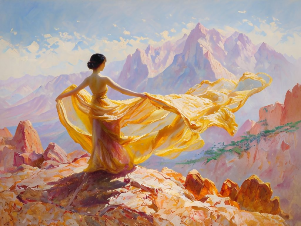 Artistic Grace: Elegant Woman in Gold Dress Against Mountain Backdrop