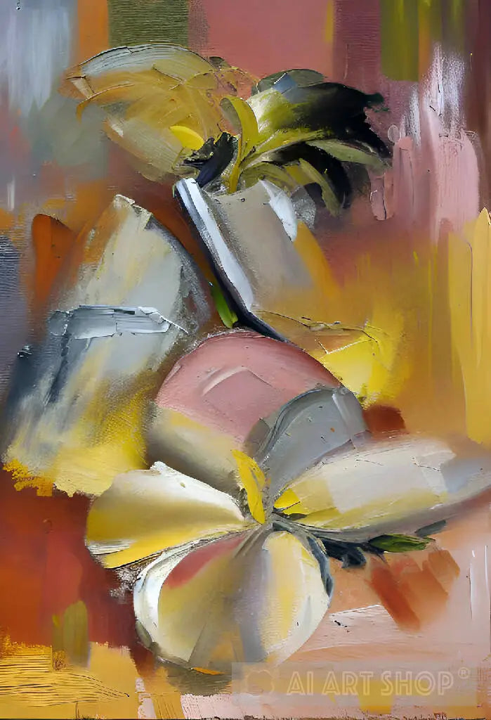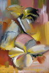 Very painterly abstracted flowers opening to the morning sun in a modern vein. Looks as if was done with a spatula making thick luxurious strokes of paint. A very visceral painting. You can almost feel the thickness of the paint. Beautiful tones of golden yellows, shades of pink, green, and iron oxide red are used in this expressionist painting in which you can almost feel the artists application of the paint.