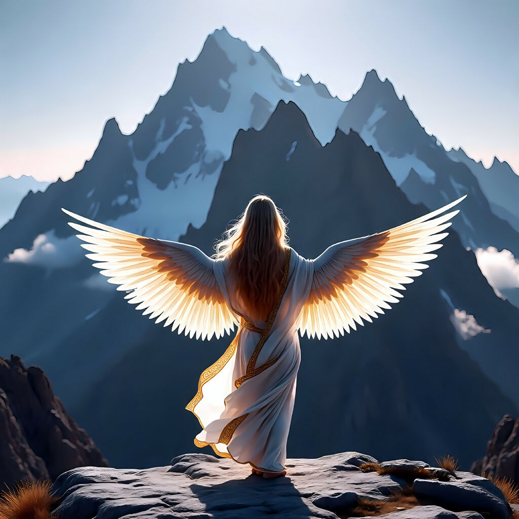 Experience a moment of divine serenity with "Ascendance of the Guardian," a breathtaking piece of surreal AI art that captures the intersection of the earthly and the eternal. This masterpiece depicts a golden-winged celestial figure standing atop a rugged precipice, overlooking a vast, snow-dusted mountain range bathed in the soft glow of a hidden sun. The intricate detail of the feathers and the flowing silken robes creates a sense of movement and grace against the stillness of the peaks.