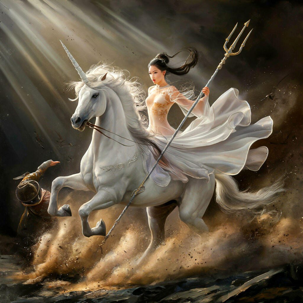 Asian Female Warrior Riding Unicorn at Battlefield. A female warrior in white attire rides a white unicorn with a golden horn through a battlefield. She holds a golden spear, her long hair flowing, exuding a sense of power and grace. The unicorn s mane and tail are flowing as well, creating a dynamic scene. Sun rays burst from behind, illuminating figures in the background shrouded in dust and shadow, suggesting a battle in progress. The ground appears rocky, with glowing embers scattered around.