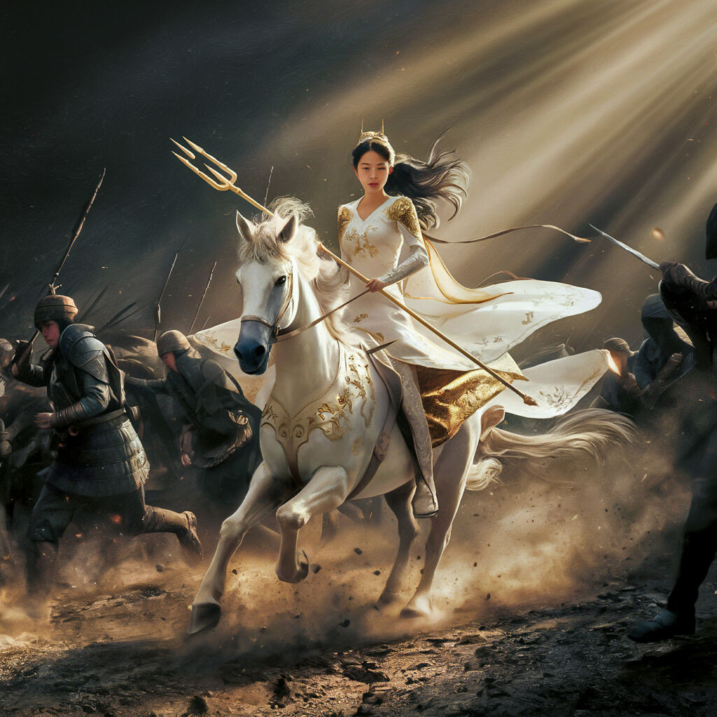 Asian Female Warrior Riding Unicorn at Battlefield. A female warrior in white attire rides a white unicorn with a golden horn through a battlefield. She holds a golden spear, her long hair flowing, exuding a sense of power and grace. The unicorn s mane and tail are flowing as well, creating a dynamic scene. Sun rays burst from behind, illuminating figures in the background shrouded in dust and shadow, suggesting a battle in progress. The ground appears rocky, with glowing embers scattered around.