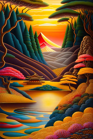 A serene Asian temple nestled in a tranquil mountain valley, surrounded by misty peaks and lush greenery. The temple’s elegant architecture, with curved roofs and intricate details, harmonizes with the natural beauty of the landscape. A beautifully tended garden unfolds in the foreground, bursting with vibrant flowers, trees, and winding paths that invite peaceful contemplation. The scene radiates a sense of spiritual calm and timeless harmony between nature and human craftsmanship.