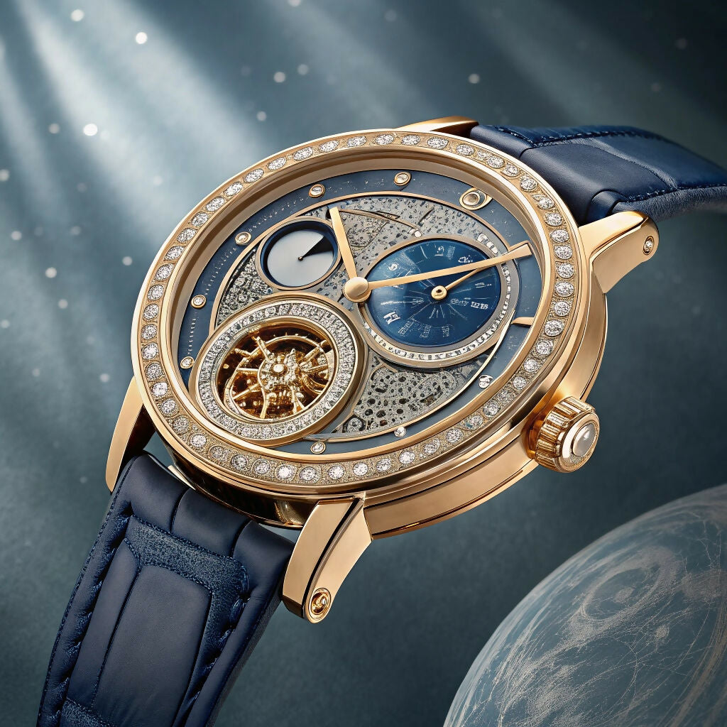 A high-angle, full shot of a luxury wristwatch.