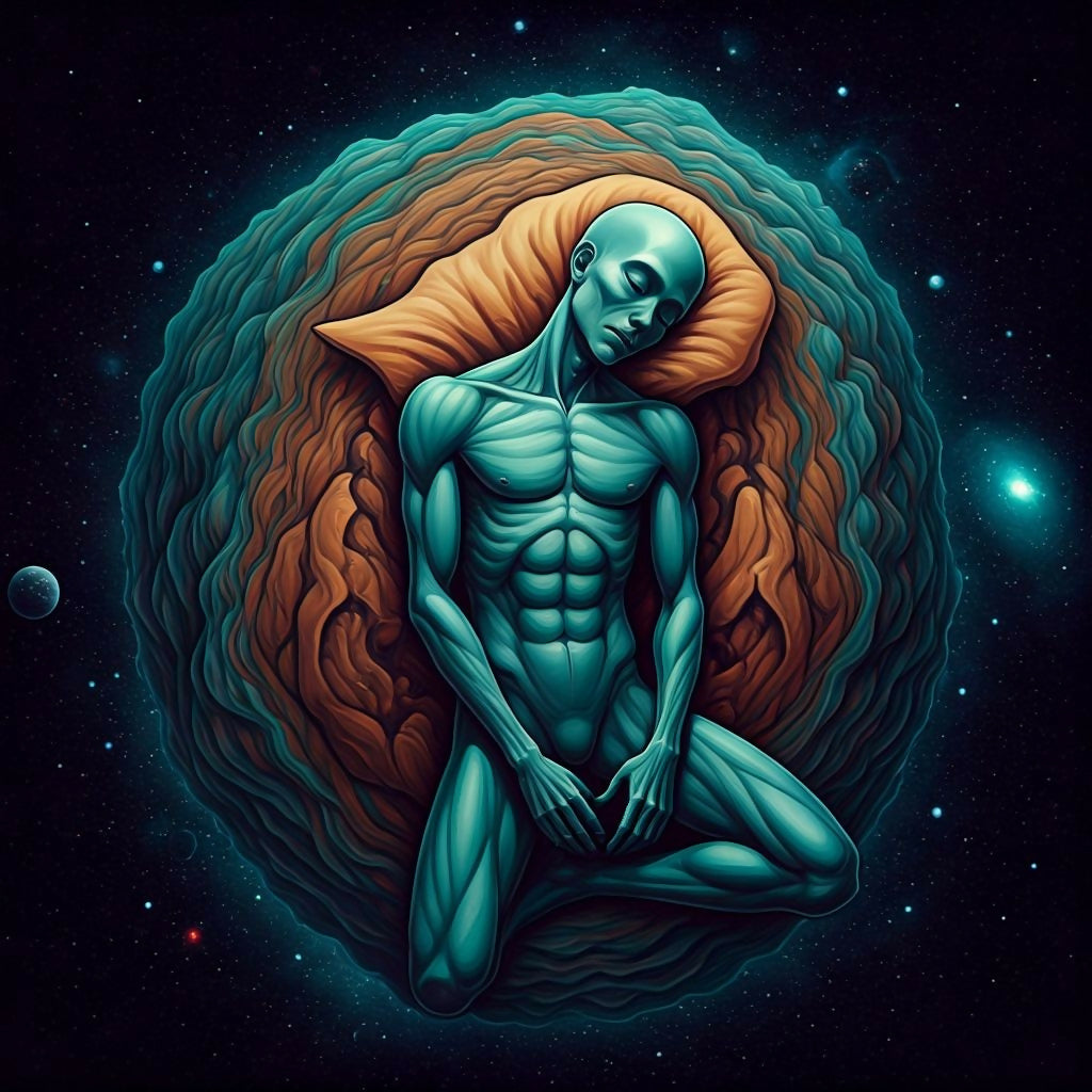 A blue‑toned figure rests in a quiet, curled pose, suspended within an organic, textured sphere that feels part cocoon and part celestial body. Soft highlights trace the contours of the body, creating a sense of calm, vulnerability, and transformation. Surrounding the figure is a vast cosmic expanse filled with stars, drifting light, and distant galaxies, blending human form with the immensity of space. The composition evokes themes of rebirth, introspection, and the delicate connection between life and the universe.