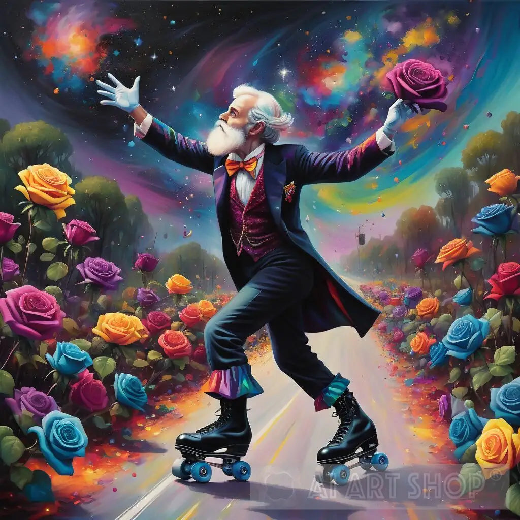 magician in roller skates with a rose multicoloured theme background and galatic coloured skyline