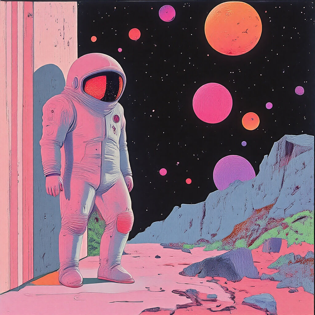 This piece is part of my Astronaut series, one of four in the collection. It depicts an astronaut drifting through space, guided by balloons, eventually landing on Jupiter. The soft pink and peach tones bring a harmonious balance to the artwork and illustration.