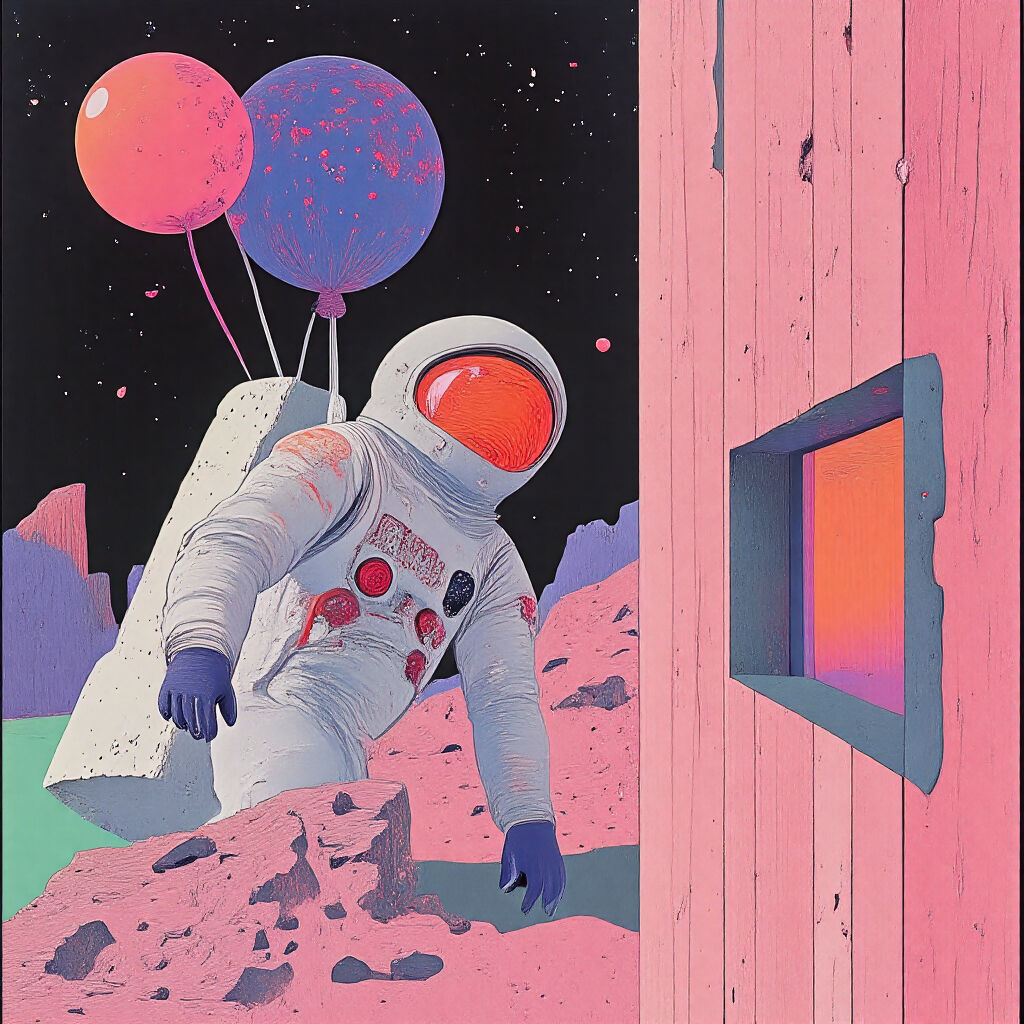 This piece is part of my Astronaut series, one of four in the collection. It depicts an astronaut drifting through space, guided by balloons, eventually landing on Mars. The soft pink and peach tones bring a harmonious balance to the artwork and illustration.