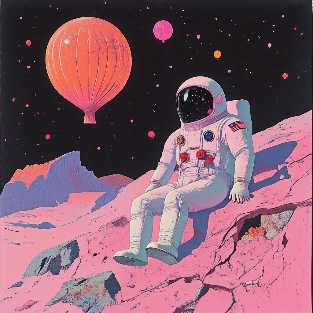This piece is part of my Astronaut series, one of four in the collection. It depicts an astronaut drifting through space, guided by balloons, eventually landing on Mercury. The soft pink and peach tones bring a harmonious balance to the artwork and illustration.