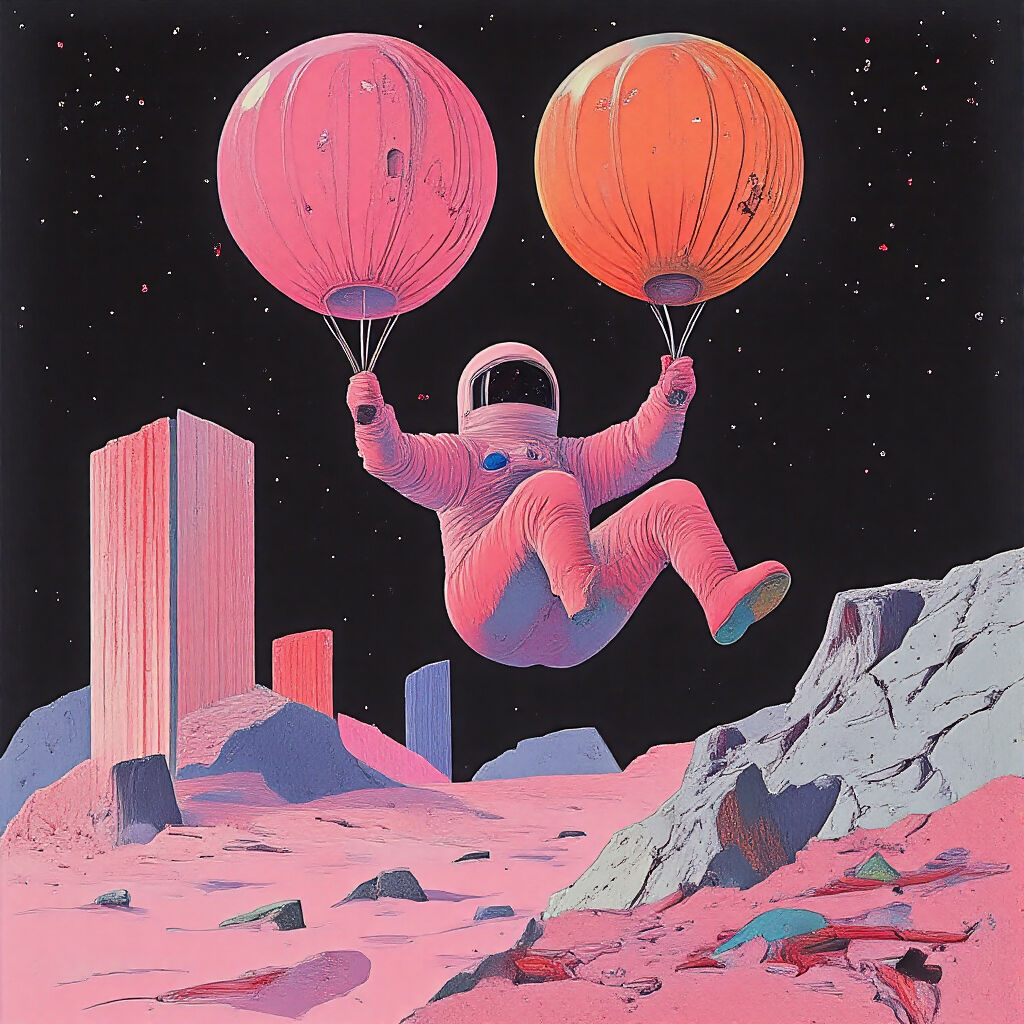 This piece is part of my Astronaut series, one of four in the collection. It depicts an astronaut drifting through space, guided by balloons, eventually landing on Pluto. The soft pink and peach tones bring a harmonious balance to the artwork and illustration.