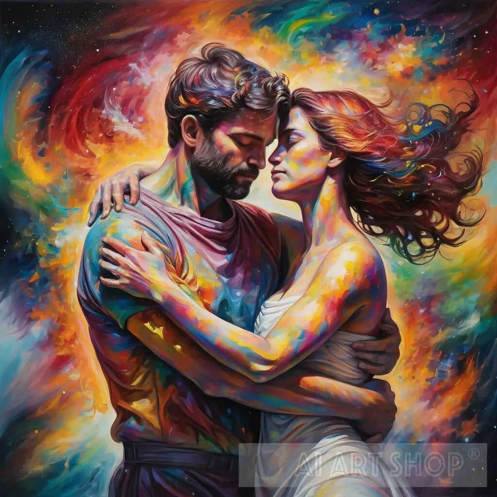 simple A.I art of couple embracing each other in galaxy of immersed colours as the background theme..love forever