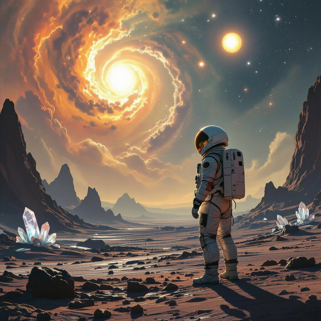 An astronaut in a worn suit stands on a barren alien planet, looking at a sky with twin suns and nebulae. Features crystalline formations and cinematic lighting, evoking classic sci-fi art.