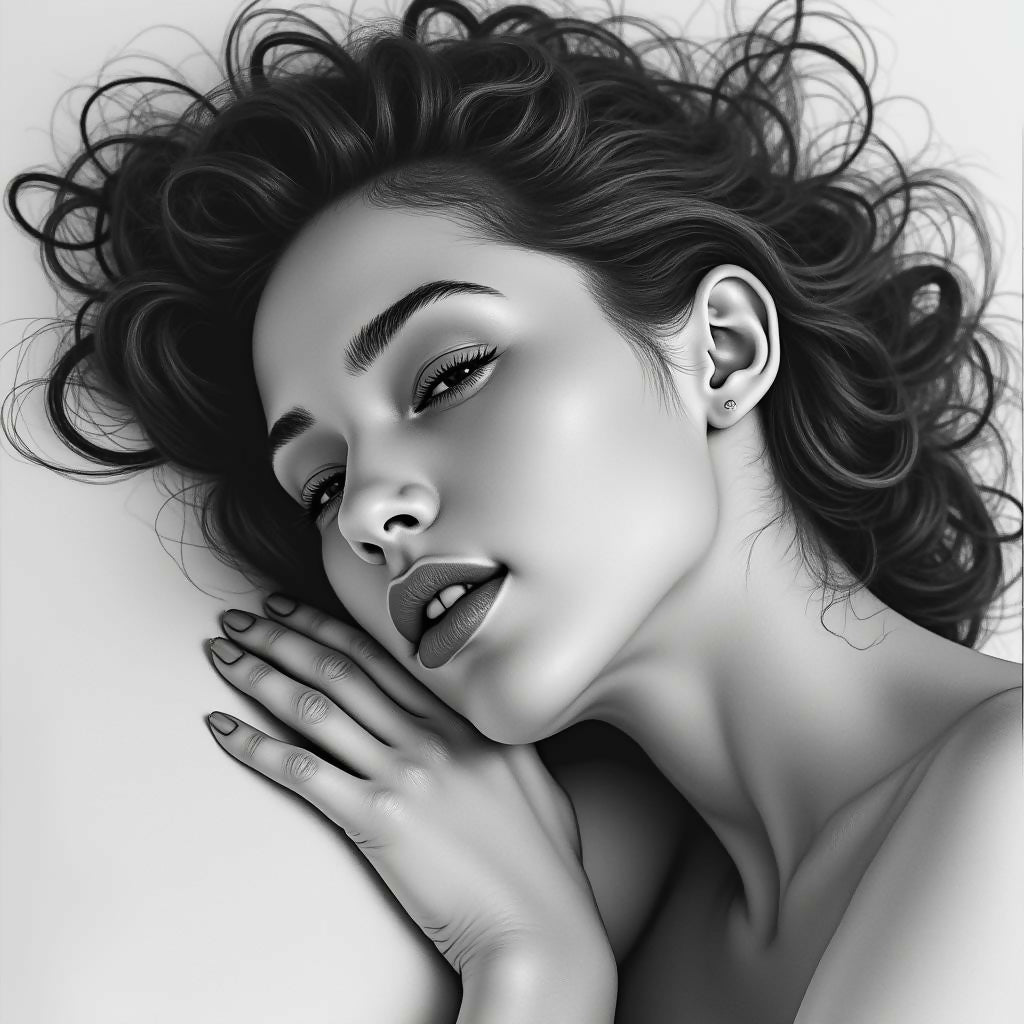 Portrait of woman laying down resting, sketch, black and white, soft subtle shading and highlights