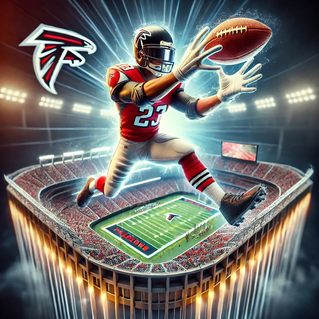Experience the ultimate fusion of sports and art with this electrifying Atlanta Falcons 3D collectible! Featuring a dynamic football player mid-catch, glowing with energy and intensity, this stunning display piece brings the thrill of the game right to your space. Crafted with vibrant detail, a miniature stadium base, and illuminated goalposts, it's the perfect centerpiece for any Falcon fan, sports enthusiast, or collector. Elevate your game-day setup and celebrate your team with this one-of-a-kind masterpiece—get yours today before they're gone!