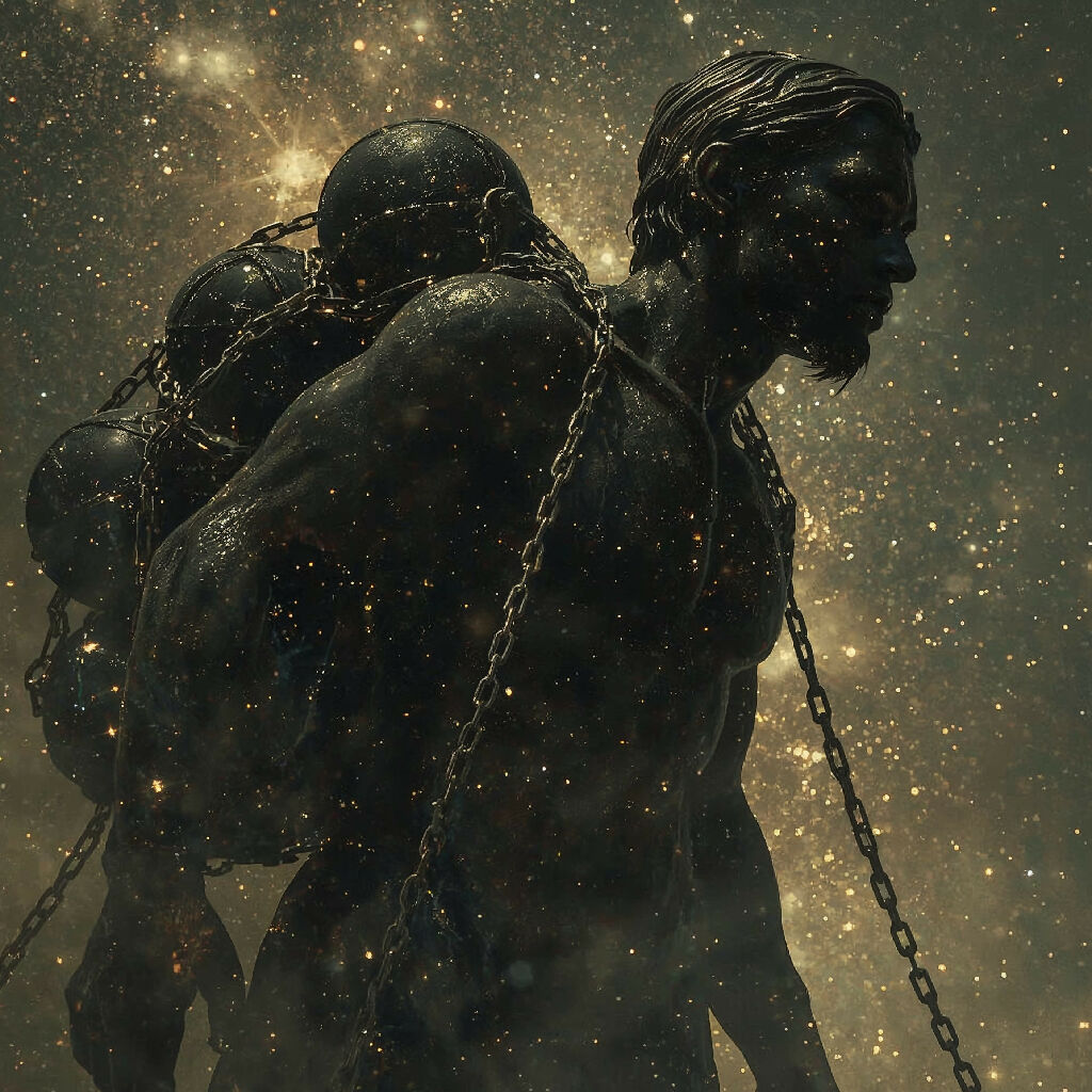 A solitary figure bears the crushing weight of dying planets, their spherical forms chained to his silhouetted back like cosmic burdens. The composition transforms the classical myth of Atlas into a meditation on cosmic responsibility and environmental collapse. Each chained world appears lifeless yet luminous against the stellar backdrop, suggesting both death and the lingering beauty of what was lost. The figure's posture speaks to heroic endurance in the face of universal decay, while the golden starfield creates a paradoxical sense of hope amid catastrophe. The chains that bind these dead worlds to their bearer become symbols of inescapable connection to creation's fate.
