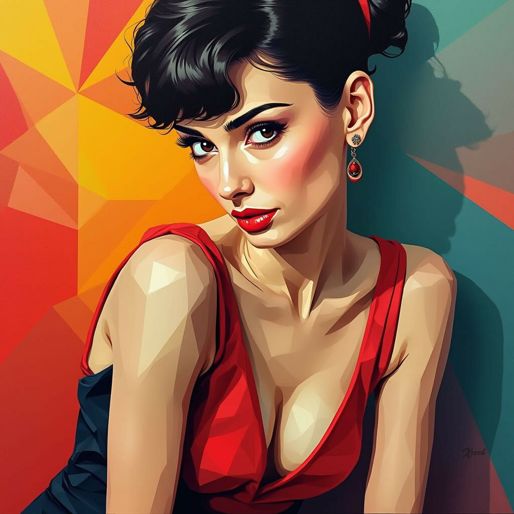 The painting is a captivating representation of modern beauty rendered in a distinctive, geometric style. It balances sensuality and elegance with precision and energy, creating a visually dynamic artwork that feels both vibrant and sophisticated.