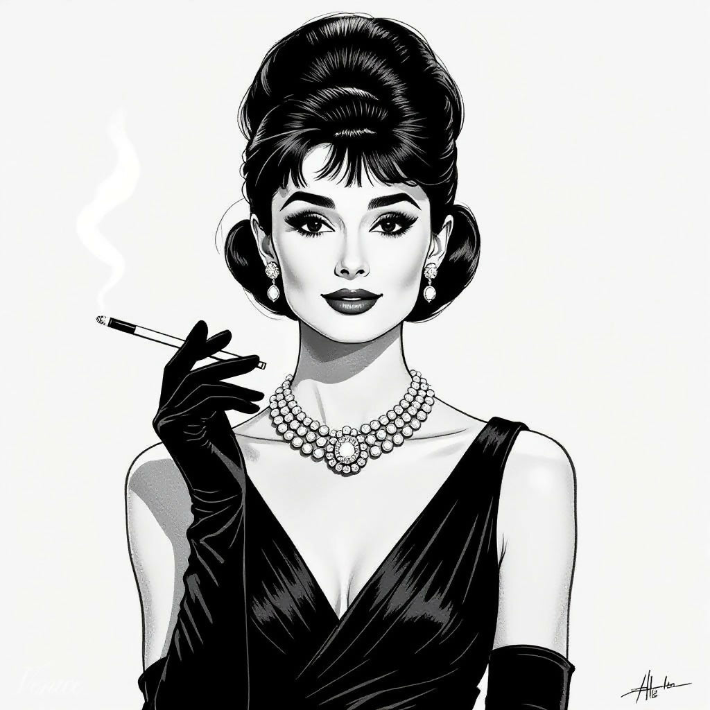 Discover Audrey Hepburn Timeless, a striking black-and-white illustration of the iconic star. With an elegant updo, pearl earrings, a multi-strand necklace, and a cigarette holder, she embodies classic Hollywood glamour with effortless sophistication.