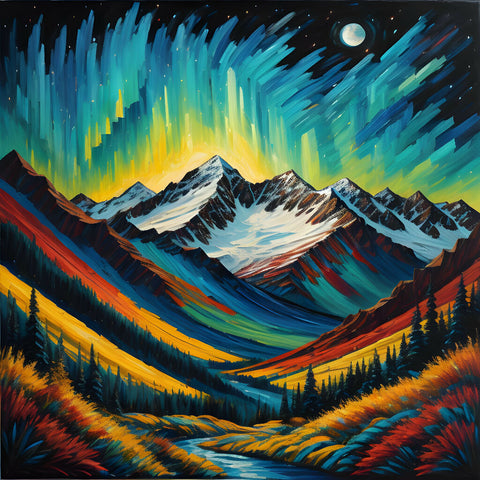 The full moon provides a meditation point, as curtains of the aurora borealis fill the sky. Silhouettes of pine trees in the mountains stand watch.
