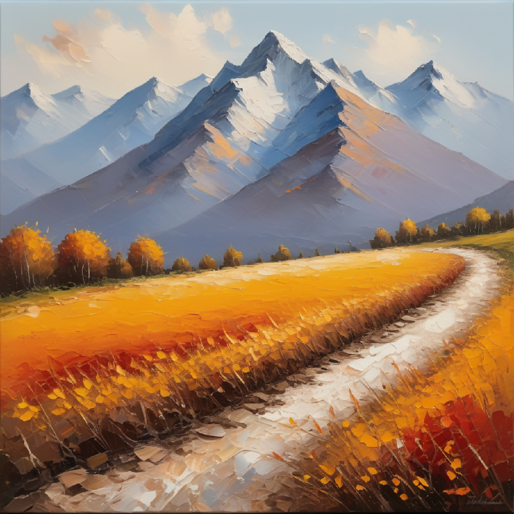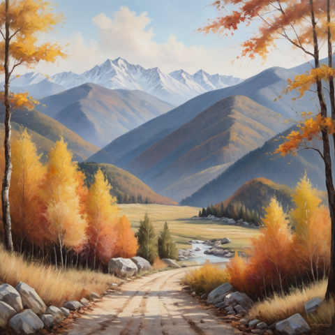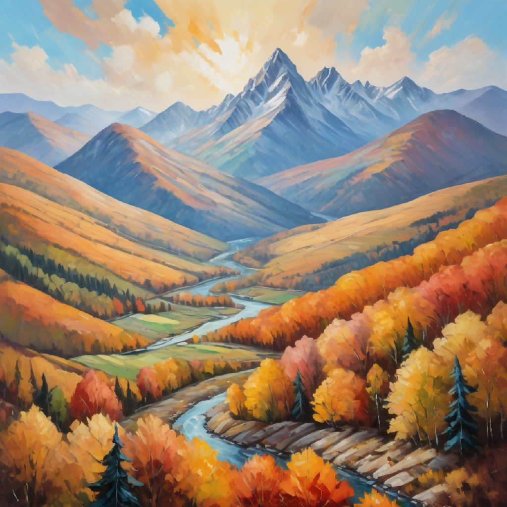Autumn landscape, oil painting, mountain scenery, fall foliage, colorful trees, golden fields, river view, textured painting, nature art, impasto style, scenic artwork, seasonal beauty, nature wall art