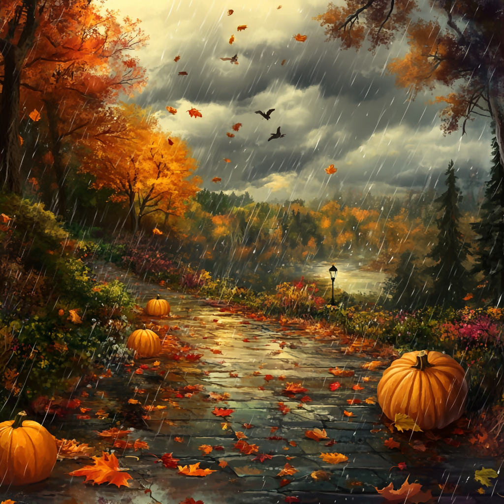 This captivating scene showcases a vibrant autumn setting, with golden leaves scattered across the ground and gentle rain falling from a moody, overcast sky. Bright orange pumpkins dot the landscape, adding a cheerful contrast to the misty atmosphere. The rain creates tiny ripples in puddles, and droplets glisten on the pumpkins and fallen leaves, evoking a sense of cozy, seasonal magic. Perfect for celebrating the charm of fall, this piece combines the serenity of a rainy day with the warmth and color of the harvest season.