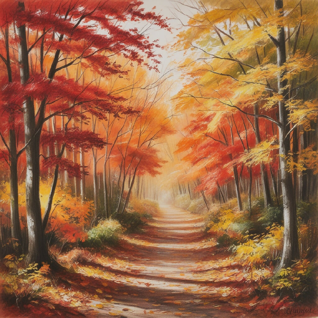 Ascene of a secluded woodland path in the heart of autumn, where the trees are ablaze with fiery reds, oranges, and yellows. The ground is carpeted with fallen leaves, and the light filters through the branches, creating a dappled effect on the path below. Use soft, quick brushstrokes to convey the texture of the leaves and the play of light. The overall atmosphere should be warm and inviting, evoking the crisp air and quiet solitude of an autumn walk.
