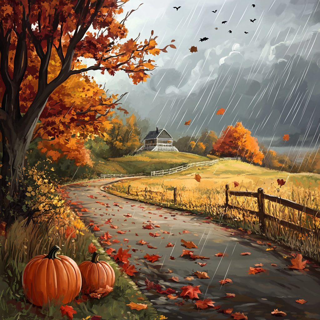 The ground is covered in a carpet of golden and amber leaves, softening the path as a quiet rain falls from above. The scene is accented by vibrant orange pumpkins scattered across the landscape, offering a joyful burst of color against the misty backdrop. Raindrops create small ripples in the puddles, while droplets cling to the leaves and pumpkins, catching the light in a delicate dance. This tranquil piece beautifully blends the coziness of a rainy autumn day with the warmth and richness of the harvest season.