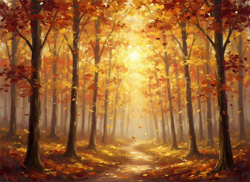 Step into the golden glow of fall with Autumn Sunshine, a serene AI-generated digital painting that captures the warmth and tranquility of an autumn forest. Tall trees stretch skyward, their leaves ablaze in hues of amber, gold, and rust. Sunlight filters through the canopy, casting soft, dappled light across a winding forest path, inviting viewers into a moment of peace and reflection.
