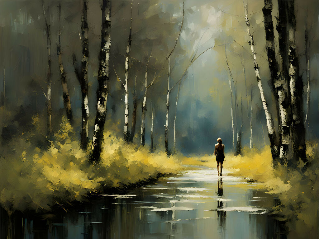 Autumn Symphony in Birch Forest. Experience the beauty of nature with this high-resolution painting of a birch forest in autumn. The deep colors and complex lighting effects create a stunning and lifelike scene.