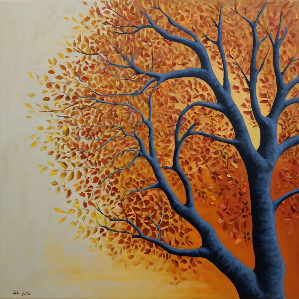 The image displays a painting of a tree with a thick trunk and sprawling branches. The leaves are depicted in shades of orange, yellow, and brown, suggesting an autumnal theme. The background is a gradient from yellow at the top to white at the bottom, which could represent the sky or light source behind the tree. This image is interesting due to its vibrant colors and the way it captures the essence of fall.