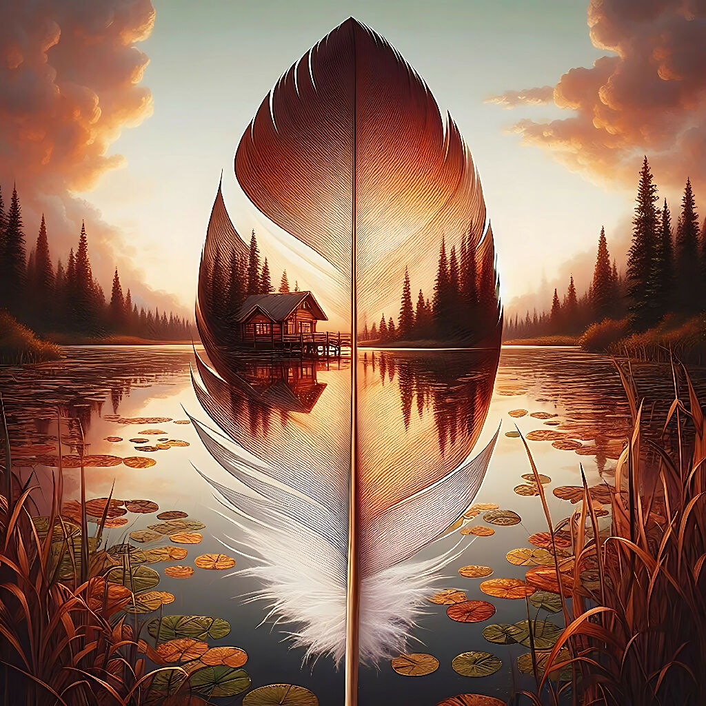 A vibrant autumnal forest scene is depicted within the contours of a large, detailed maple leaf.  The leaf is a rich blend of fiery orange, deep reds, and warm yellows, meticulously detailed to resemble a real leaf.  Within the leaf's hollow, a serene forest landscape unfolds.  Tall, slender trees with vibrant autumnal foliage line a small, winding stream flowing through the scene.  The trees' colors range from deep crimson to fiery orange and gold.  The stream reflects the surrounding colors, creating a mirror-like effect.  Rocks of varying shades of gray and brown form the riverbank, and patches of moss and low-lying vegetation add depth and texture to the scene.  Sunlight streams through the trees, illuminating the scene from the upper center, casting warm, golden highlights on the forest floor and foliage.  The composition is centered within the leaf.  The perspective is slightly above the stream, providing a tranquil, immersive view of the autumnal forest. The style is painterly and detailed, creating a sense of depth and realism. The colors are rich and warm, with a balance of light and shadow.  The overall atmosphere is serene and peaceful, evocative of a picturesque autumn day.