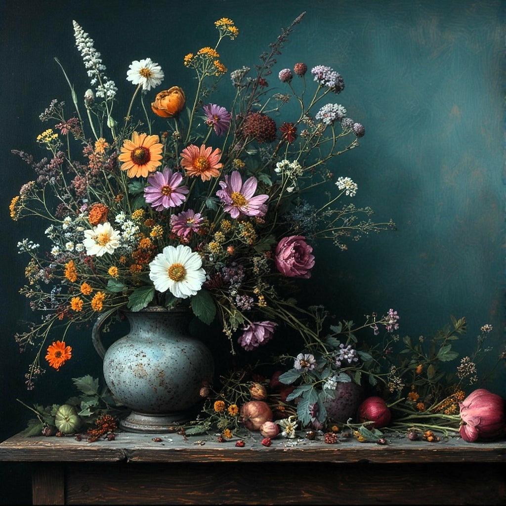 This still life painting captures a lavish and diverse bouquet of flowers, bursting with vibrant autumnal hues and rich textures. Set against a deep, moody teal background, the arrangement features a tapestry of white daisies, bright orange and yellow blooms, delicate purple and pink blossoms, and various wild foliage.