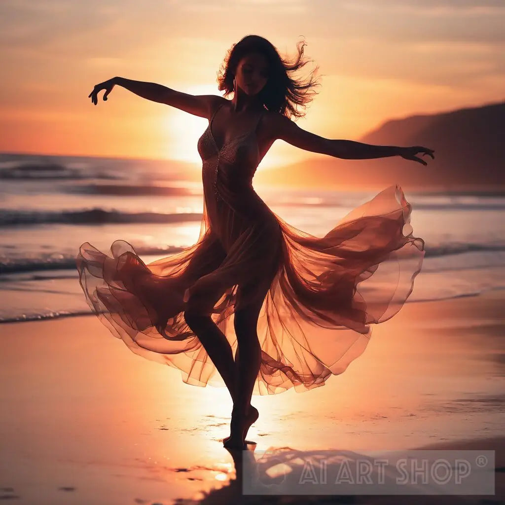 ballerina dancing away on the beach at sunset