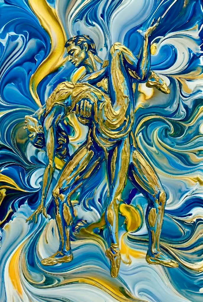 The piece captures a moment where human form dissolves into pure energy. The thick, impasto strokes of gold and blue don’t just define the dancers; they trace the very path of their movement through space. It is a visual representation of the strength required to make high-intensity performance look like a seamless, liquid dream.