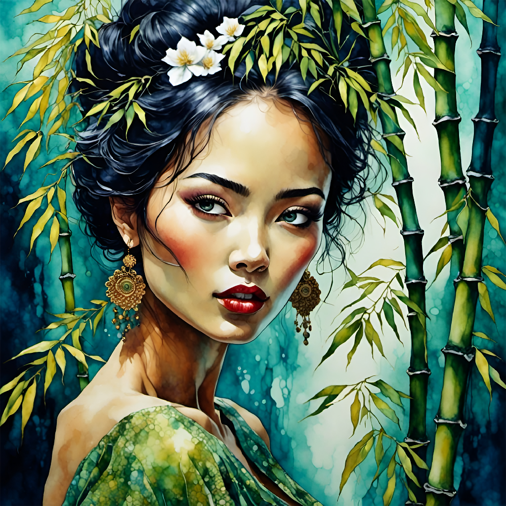 Immerse yourself in the tranquil beauty of this digital artwork featuring a close-up portrait of an Asian girl amidst a lush green bamboo forest. Her calm, expressive eyes reflect the serenity of nature, while the soft, filtered sunlight dances through the towering bamboo stalks, casting delicate patterns of light and shadow