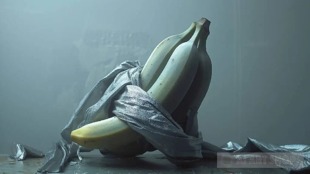 A contemporary art piece centered around a bunch of bananas, featuring a thin silver ribbon wrapped around the bananas. The silver ribbon has a shiny, wrinkled texture that contrasts with the smooth curves of the bananas. This combination illustrates one way contemporary art creates new meaning by adding extraordinary elements to everyday objects. By taking an everyday fruit, the banana, and transforming it with a silver, shiny ribbon, the artist gives a universal object a new visual context and meaning. In doing so, the viewer is challenged to explore new interpretations of everyday objects.