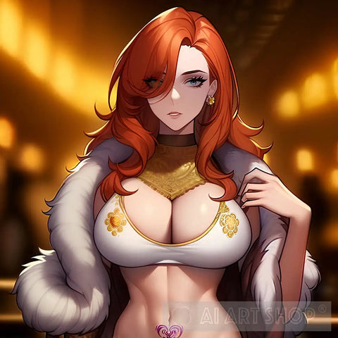 Introducing an exquisite AI-generated anime artwork that captures the essence of chic and sophistication. This masterpiece features a stunning Ginger, sporting a stylish braided jacket and trendy fur, exuding confidence and elegance. Her small yet alluring posterior is perfectly complemented by a gorgeous midriff-baring blouse, while her intricate cutoff shorts highlight her impeccable taste.