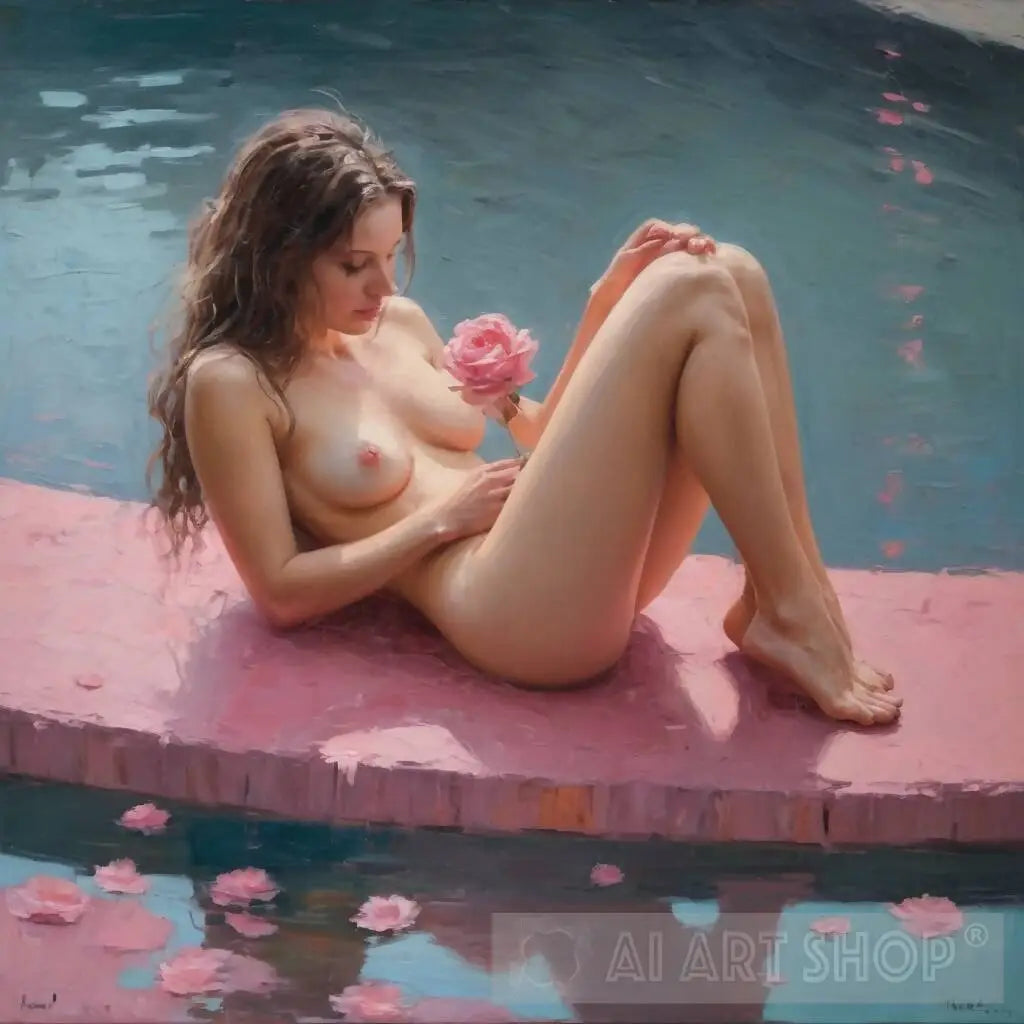"Bathing in Tranquility" invites viewers to embrace the serene atmosphere and appreciate the simple yet profound beauty of the human form and nature's offerings.