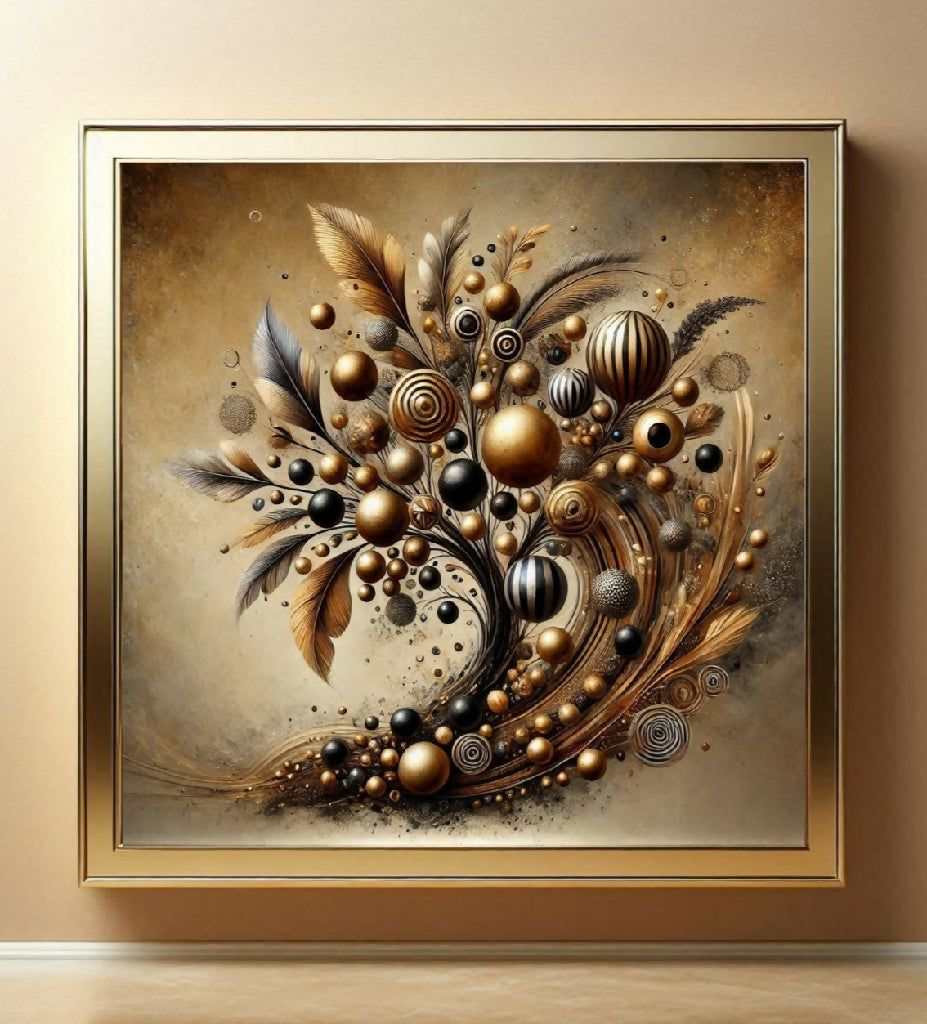 Eine abstrakte Darstellung eines Baumes mit goldenen und schwarzen Kugeln als Früchte und goldenen und schwarzen Blättern. Das Bild ist in goldenen und braunen Tönen gehalten und wirkt opulent und dekorativ.