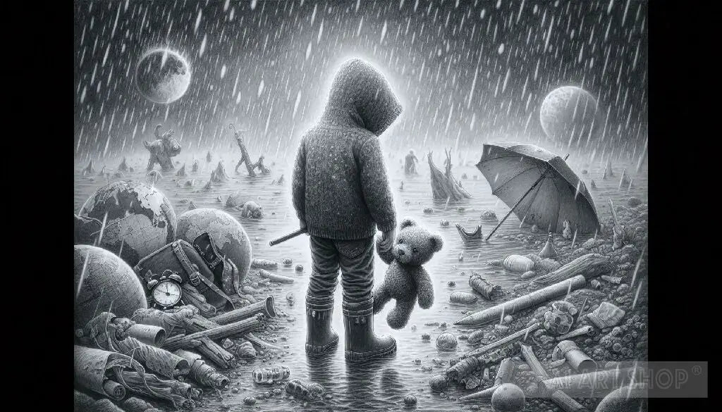 Bearing the Change ——Child Lost Teddy Bear Due to Global Warming: In this poignant and thought-provoking image, a child stands amidst a changing landscape. The once familiar surroundings have been altered by the effects of global warming. The child clutches a tattered teddy bear, a symbol of comfort and innocence. The extreme temperatures—scorching heat and bitter cold—have reshaped life as we know it. Rain and snow fall irregularly, disrupting ecosystems and challenging our resilience. The pencil-drawn realism captures the urgency of the climate crisis, : In this poignant and thought-provoking image, a child stands amidst a changing landscape. The once familiar surroundings have been altered by the effects of global warming. The child clutches a tattered teddy bear, a symbol of comfort and innocence. The extreme temperatures—scorching heat and bitter cold—have reshaped life as we know it. Rain and snow fall irregularly, disrupting ecosystems and challenging our resilience. The pencil-drawn realism captures the urgency of the climate crisis,