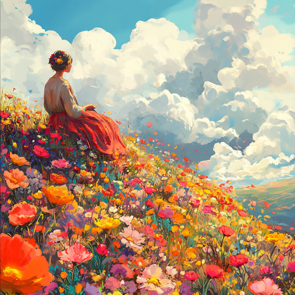 Beautiful flowered meadow, cute girl looking far, cloudy sky