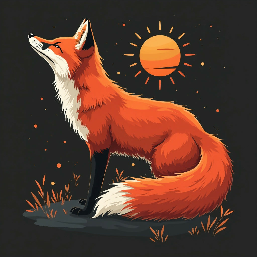 Beautiful fox This artwork captures the natural grace of a fox sitting quietly in a tranquil forest setting. Its rich, fiery orange fur contrasts beautifully with the earthy tones of the surroundings, while white markings on its chest and tail add a touch of softness to its appearance. The fox's sharp, intelligent eyes and poised stance convey both curiosity and serenity, as if it’s calmly observing its world. The forest backdrop, with tall trees and scattered leaves, adds depth and a sense of quiet harmony to the scene. This piece celebrates the understated beauty and natural elegance of the fox in its untouched habitat.