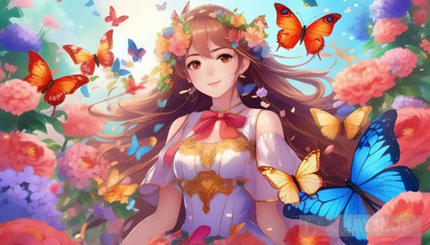Beautiful Girl Surronded By Many Flowers & Butterflies