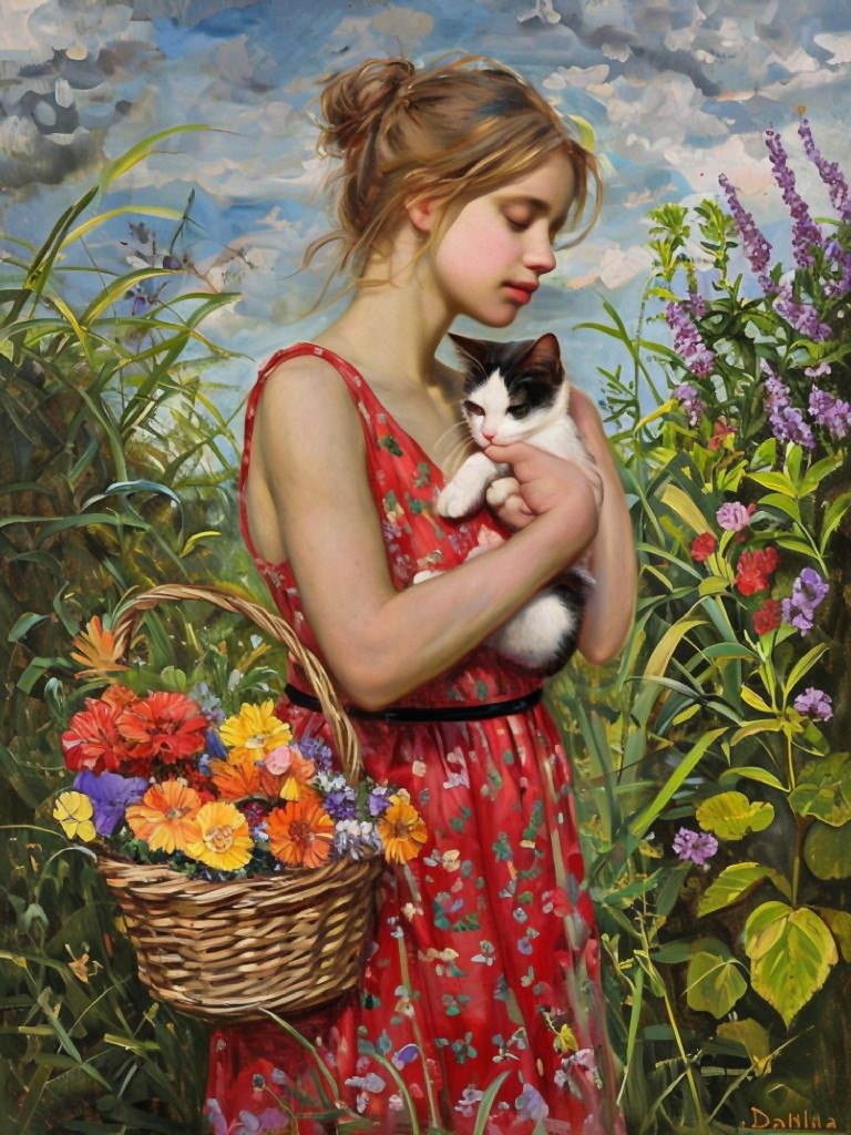 Discover the serene beauty of this captivating digital art print featuring a beautiful girl tenderly holding an adorable kitten amidst a lush summer meadow. This exquisite painting captures a timeless scene of innocence and nature, complete with a charming flower basket overflowing with vibrant wildflowers. Perfect for adding a touch of whimsical charm and rustic elegance to any space.