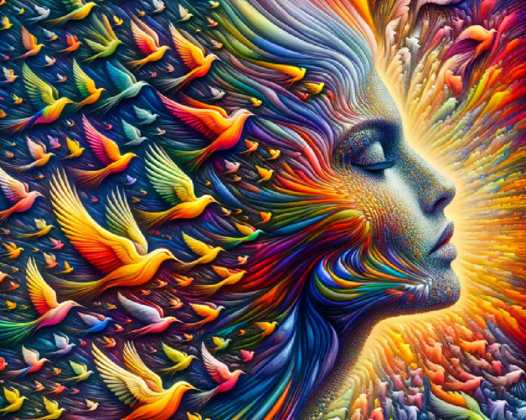 A vibrant artwork of a woman's profile with a colorful, flowing mane transitioning into a flock of birds against a dynamic, textured background.