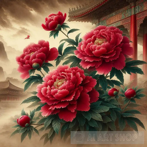Beautiful Red Peonies in Full Bloom in Ancient Chinese Palace
